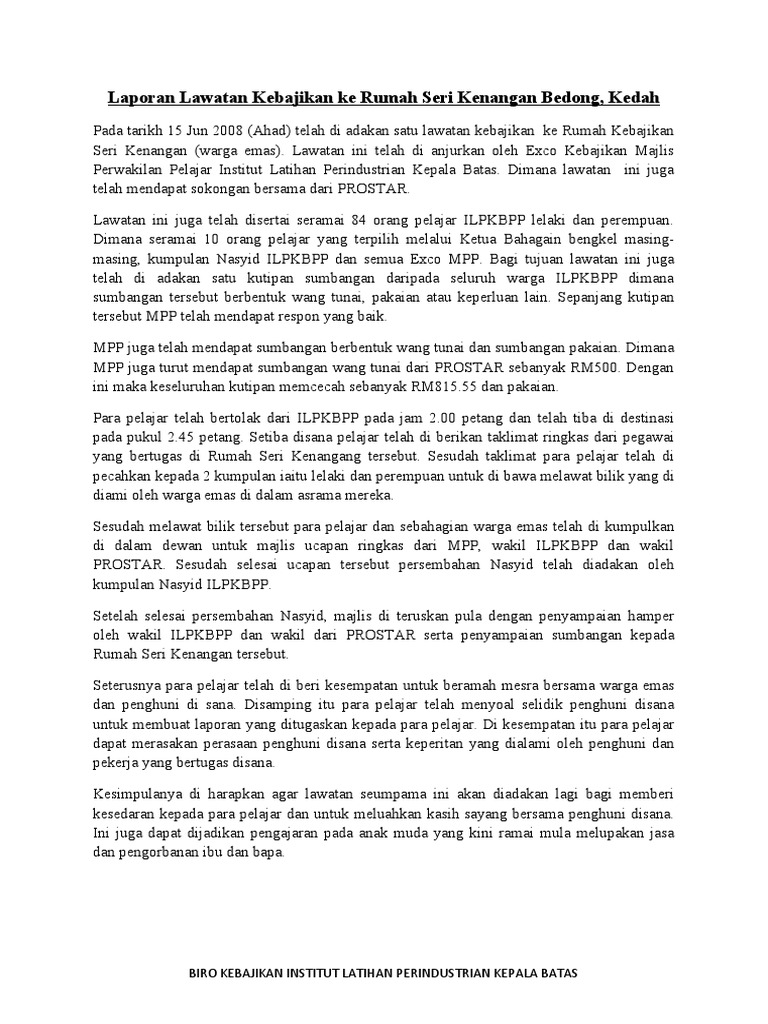 8172019 kertas kerja lawatan laporan ke rumah warga orang tua 11 kertas kerja lawatan laporan ke rumah warga orang tua pendidikan sivik dan kewarganegaraan tingkatan 5. Pada cuti sekolah yang lalu saya telah menyertai satu lawatan sambil. Laporan lawatan ke rumah anak yatim.